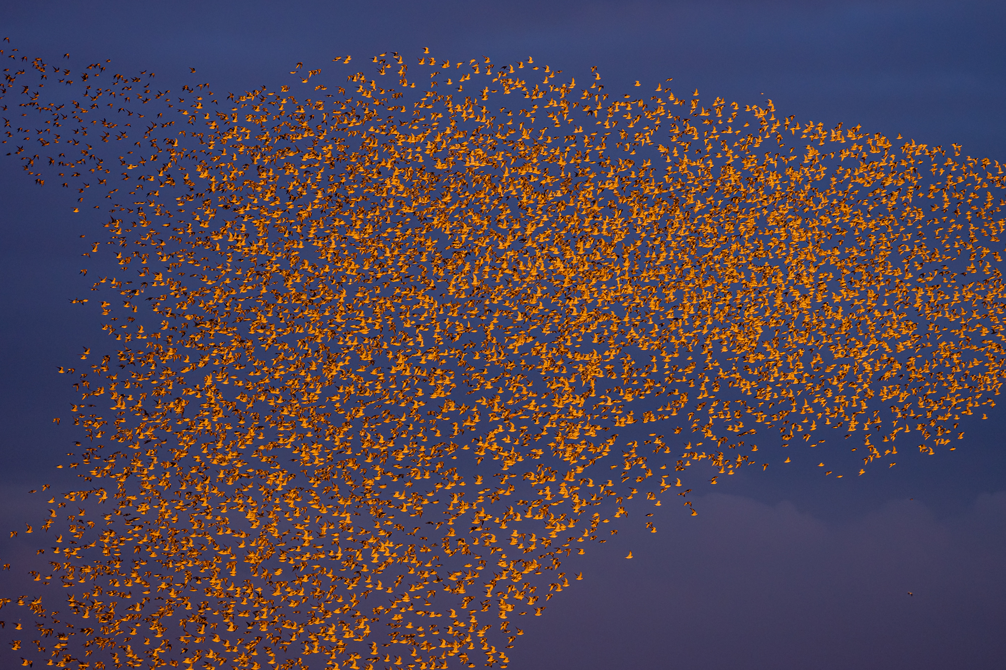 En un cielo cubierto de nubarrones, el sol se abre paso e ilumina la escena. El río está a punto de desbordarse y la impaciencia se respira entre los observadores cuando el primer correlimos alza el vuelo, y provoca una ola gigante, que asciende velocidad y crea un mosaico de formas increíble, donde con cada movimiento las plumas de las aves brillan o desaparecen mientras juegan con el sol. Se acercan, se alejan, bailan sobre nuestras cabezas y nos hacen disfrutar de uno de los mejores espectáculos que ofrece la naturaleza.